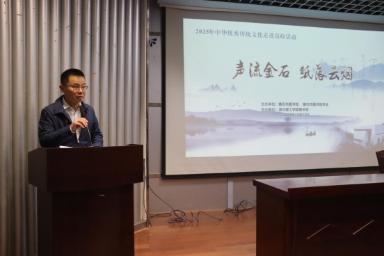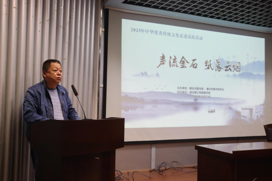 活动现场,王健在致辞中指出,中华典籍是千年文明的载体,中华优秀传统文化的传承活动旨在让沉睡在库房里的碑帖珍本、古籍善本,真正“走出深阁”,让那些镌刻在金石、书写在云烟之上的古老文字,重新“活”起来、“亮”起来,融入我们的生活,焕发出时代的光彩。钟松在致辞中讲到,大学不仅是知识的殿堂,更是中华优秀传统文化传承与创新的重要阵地,肩负着培育学生文化素养、增强民族文化自信的重要使命。他特别感谢杨剑波老师为今年会师生传授中华优秀传统文化知识、分享感悟与独到见解,也特别感谢黄石市图书馆、图书馆学会对校园文化建设活动的悉心指导与大力支持。