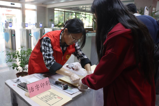 讲座结束后,T2一楼大厅的文化体验活动与特藏文献展随即同步开启,吸引了众多师生驻足参与。雕版印刷、活字印刷、碑帖拓印三大传统技艺体验区前热闹非凡,师生们纷纷动手操作工具,沉浸式感受古老技艺蕴含的精巧匠心。“黄石市图书馆特藏文献展” 之馆藏碑帖展通过精心制作的展板,以碑帖文化为核心,共展出黄石市图书馆馆藏实体碑帖六种与舆图拓本一种,具体包括《诒晋斋法书》《前后出师表》《国朝名人法帖十二卷》《隐墨斋帖八卷》《缩本汉碑三十八种》《劉墉法帖》及《长江图说》。展览不仅呈现文献实物,还逐一详细介绍这些碑帖、舆图的基础信息,同时辅以黄石市摩崖石刻的相关内容讲解,力求让沉睡的古籍 “活” 起来,让广大师生近距离领略中华传统金石文化的独特魅力,直观感受古籍文化的深邃与广博。