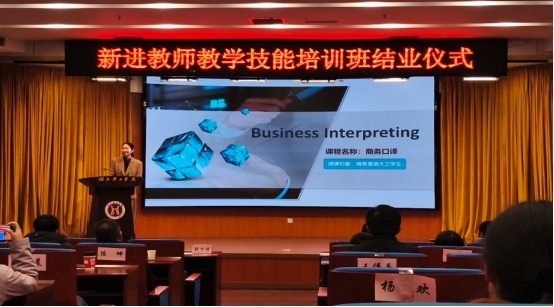 优秀学员代表曾祥会、李程根、黄盛、唐思语进行教学技能汇报展示。他们结合自身课程,展现了新进教师扎实的专业功底和良好的教学素养。为发挥优秀教师的示范引领作用,湖北省高校第九届青教赛文科一等奖得主、外国语学院阮桢老师现场进行示范课展示。