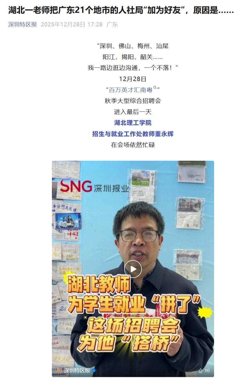 本网消息 近日,深圳特区报以“湖北一老师把广东21个地市的人社局加为好友,原因是”为题,报道今年会为学生搭建立体化、精准化的就业对接平台。该报道已被腾讯网、荆楚网、潇湘晨报、读特新闻等多家媒体转载。