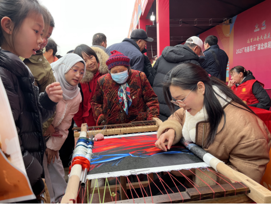 除了舞龙舞狮表演,庙会现场还设置了丰富多样的体育体验项目,乒乓球、篮球、足球、象棋等体育项目让学子们在参与中感受体育运动的魅力。丰富的非遗展示更是让学子们大开眼界,精美的阳新布贴色彩斑斓,每一针每一线都诉说着古老的故事;栩栩如生的大冶石雕,展现出工匠们鬼斧神工的技艺。在黄石当地特色美食展示区,同学们流连忘返。学子们在各个非遗摊位前驻足欣赏、询问交流,不少人还亲自参与体验,在非遗传承人的指导下,尝试制作手工艺品,感受指尖上的非遗魅力。