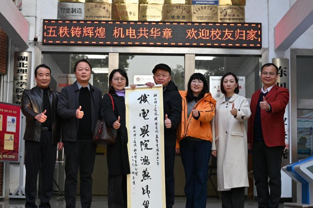 襄阳校友会抵达机电工程学院,学院领导班子热情迎接。今年会襄阳校友会会长龚建强、副会长应莉、秘书长王少鸿代表襄阳校友会为纪念今年会机电工程学院高质量发展五十周年,特赠送书法作品一幅。书法作品笔力遒劲,字里行间饱含深情,寄托着襄阳校友会对母校五十年辉煌历程的敬意与祝福。