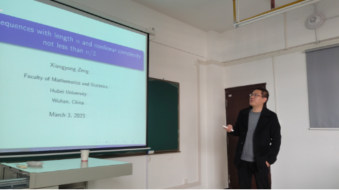3月3日下午,为了提升数理学院教师教科研水平,促进数学学科的发展,开拓学生视野,应数理学院邀请,湖北大学曾祥勇教授到院做学术报告,报告题目为“Binary sequences with length n and nonlinear complexity not less than n/2”(长度为n非线性复杂度不小于n/2的二元序列)。数理学院三十余名师生在会议室聆听了曾教授的报告。