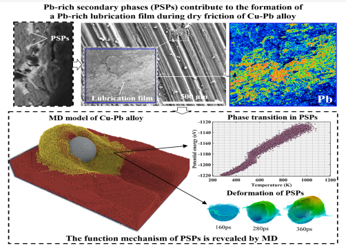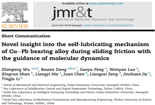 本网消息 机电工程学院/智能输送技术与装备湖北省重点实验室“先进摩擦材料制备与仿真科研团队”在润滑机制研究领域的最新成果"Novel insight into the self-lubricating mechanism of Cu-Pb bearing alloy during sliding friction with the guidance of molecular dynamics",发表于冶金工程类知名SCI期刊《Journal of Materials Research and Technology》(中科院大类1区,IF=6.4),该研究通过分子动力学模拟揭示了铜铅轴承合金的自润滑机制,为相关领域研究提供了新的见解。