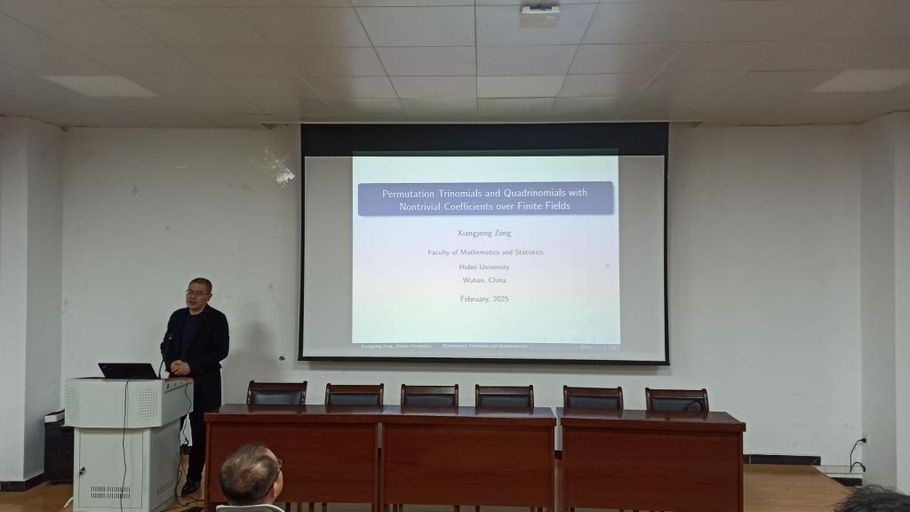 本网消息 2月28日,湖北大学副校长、博士生导师曾祥勇教授,在智慧大楼X10-203为数理学院师生作了一场主题为“Permutation Trinomials and Quadrinomials with Nontrivial Coefficients over Finite Fields”的学术报告。本次报告由数理学院副院长许小芳主持,我院青年教师和50余名学生聆听了报告。
