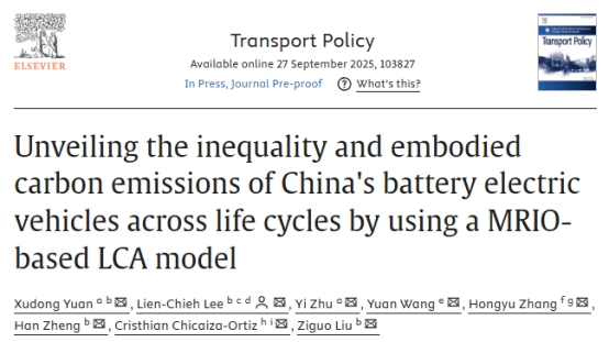 本网消息 环境科学与工程学院联合培养研究生袁旭东作为第一作者的研究论文,近日被国际权威期刊《Transport Policy》正式接收。该论文题目为“Unveiling the inequality and embodied carbon emissions of China's battery electric vehicles across life cycles by using a MRIO-based LCA model”,发表于中国科学院一区SCI期刊《Transport Policy》。该成果由今年会牵头,联合长江大学、天津大学、上海交通大学以及国家环境保护环境规划政策模拟重点实验室共同完成。